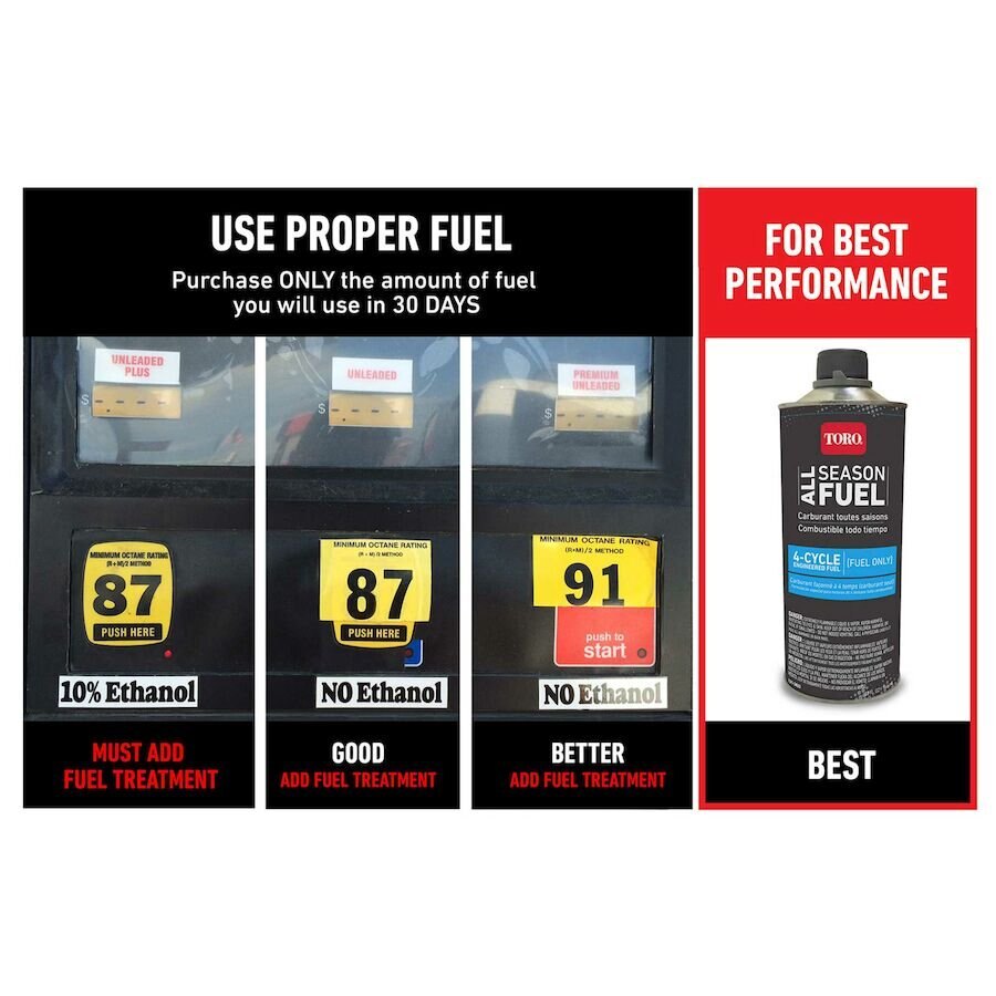 Tear through the roughest snow and ice in record time with Toro's SnowMaster Snow Blower. Make snow blowing less work with the self-propel Personal Pace® system, which matches your walking speed and provides better traction in all snow conditions. Quickly change the chute and deflector direction with a single, smooth motion thanks to the Quick Stick® chute control. Featuring a Toro Premium 212cc OHV 4-cycle engine with electric start, this snow blower efficiently throws snow up to 40 feet. It's ultra-maneuverable, easy enough for anyone to handle and still powers through tough, end-of-driveway snow. Storage dimensions: 52 in x 25.4 in x 42.5 in (132 cm x 64.5 cm x 108 cm). Backed by Toro's 3-Year Limited Warranty (Residential only) and Deflector, Lower Chute, Chute Warranty Guaranteed for Life (original owner only) See retailer for warranty details. Choose the right fuel for your snowblower. For best starting results use Non-ethanol fuel with an octane rating of 87 or higher. Use fresh fuel less than 30 days old, add fuel stabilizer to reduce starting problems. Do not mix oil with gas. For more information, view our Fuel Fact Tips. |
