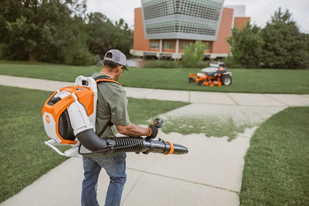 LESS NOISE IN THE SURROUNDINGS. The innovative technology significantly reduces the volume (sound power level) for residents and passers-by. At the same time, disruptive frequencies are minimized to create a pleasant sound pattern. Sound emissions are reduced at the high-performance turbine input in such a way that the leaf blower sounds equally quiet to nearby people on all four sides. |