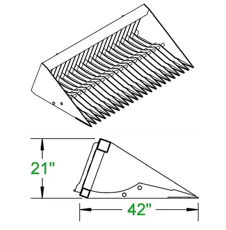 Bigger is better with the CID Heavy Duty and X-treme rock buckets. Our XD version has has fully welded front cutting teeth, while the HD version uses a 3/4″ x 6″ cutting edge. This edge will be upgraded to a 1″ x 8″ when adding the optional teeth. The HD version has tine spacing set at 2 3/8″, while the X-treme has 3″ spacing. Our top quality 1/2″ steel and 5/8″ grapple tines provide all the strength you may need for removal of rocks, logs, and brush. Has twin cylinders rated at 4,000 PSI