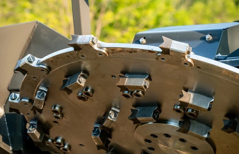 Teeth on all surfaces, deck and sides. 1" hinged deflector plate, Larger trees can be vertically mulched quickly, Machine is nimble and easily maneuvered.