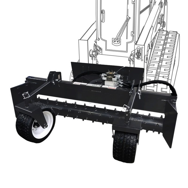 The CID X-treme Power Rake provides a versatile tool for your skid steer attachments, in a manual or hydraulic version. The X-treme Power Rake will provide the proper preparation of seedbed grading, leveling and re-conditioning of multiple surfaces. The X-treme Power Rake uses a 16-26 GPM motor inset within the drum. This unique feature ensures the motor does not extend past the width of the rake, eliminating damage to the motor due to accidental collisions. The Xtreme Power Rake’s bi-directional drum features carbide teeth and removeable side plates. The floating design ensures the rake will remian level during operation.