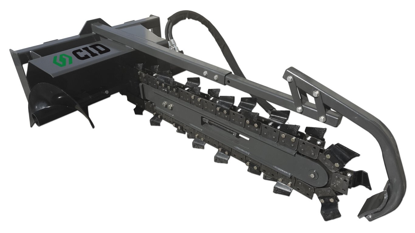 Our X-treme Skid Steer Trencher is ideal for quickly trenching water lines and cable lines. With options for a dirt chain, 1/2 rock & frost, or full rock & frost, we have the right chain for your trenching needs. There are two arm sizes for different digging depths and chain widths of 36″ or 48″. These trenchers come with a full rock guard and offer flow options of 15-20 GPM or 20-30 GPM, featuring a 15″ auger. The chain guard can be removed for getting right up alongside buildings or structures for less finish digging. The trencher also features easy tightening, and replacable blades for the chain.