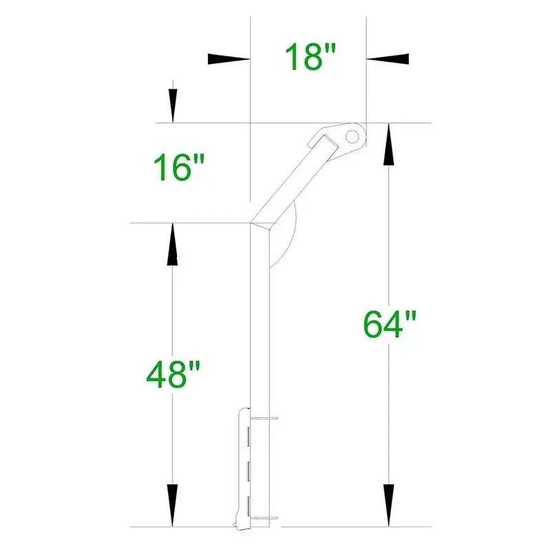 This hydraulically driven pole allows for easy transportation of your items, with the ability to extend your height by 72″. The pole has a 4×4 base with 3/8″ thick walls. The hydraulic extension arm is constructed from 3×3 tubing, and the manual extension from 2×2 tubing. The Arm is rated to carry 1200 lbs, with an angle limitation of 45 degrees. The manual extension arm can be positioned in 2 different height locations, one at 12″ and the other at 24″.